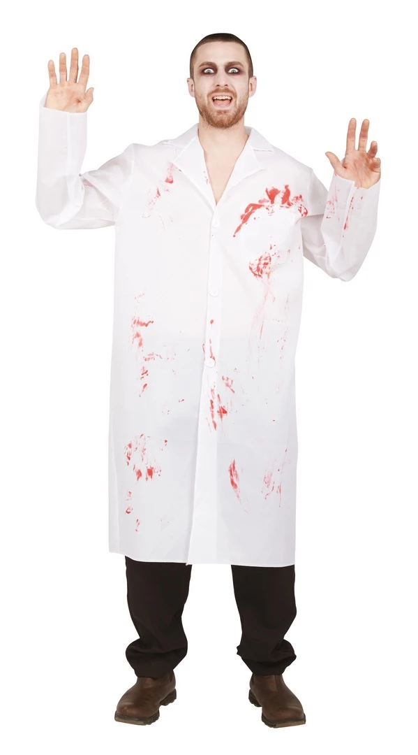 La blouse blanche du docteur, médecin, chirurgien, cet uniforme est en deux tailles adultes, une blouse manches longues, tachée de faux sang. Ce déguisement est très réaliste et idéal pour Halloween, vous allez faire beaucoup d’effet lors de votre prochaine soirée déguisée surtout si le thème est l’horreur.