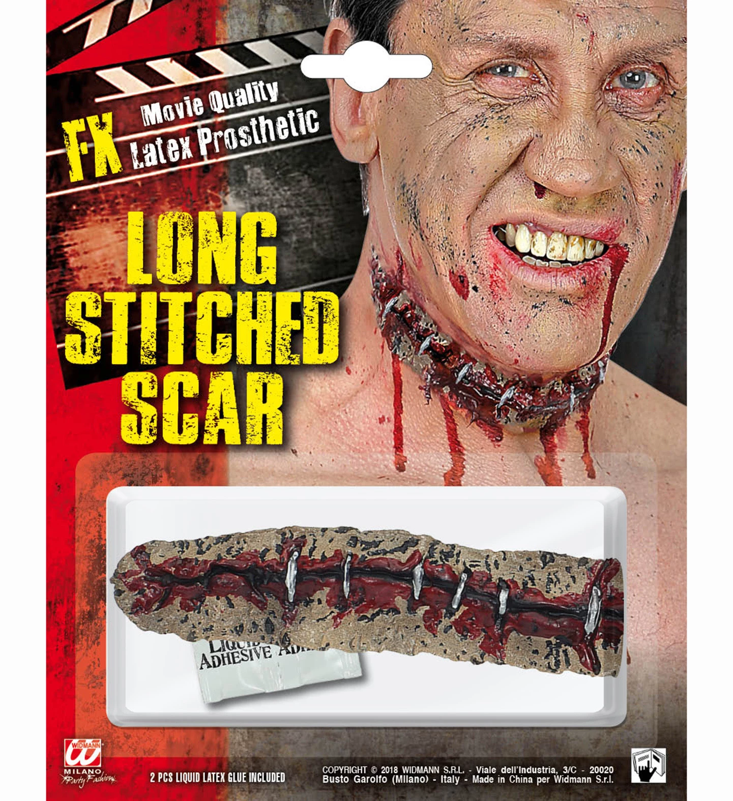 Une fausse cicatrice de la marque Widmann pour simuler un cou tranché, très réaliste avec du faux sang que vous pourrez appliquer sur votre cou sans avoir de maquillage, impeccable et pratique pour attirer l’œil des convives, comme des effets spéciaux du cinéma (voir photos). Ce maquillage terrifiant est très facile à utiliser, sans aucune contrainte, il sera idéal pour rendre plus crédible votre déguisement pour Halloween ou lors d’une soirée déguisée sur le thème de l’horreur.