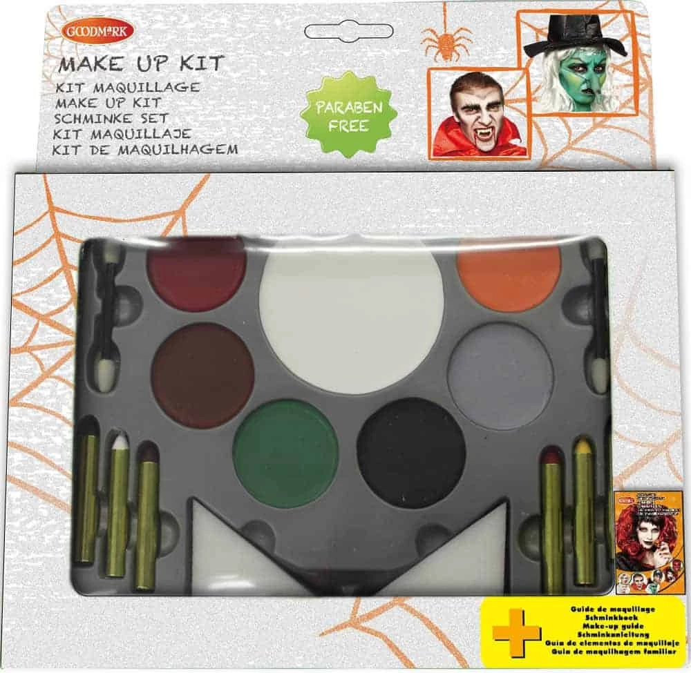 Idéal pour maquiller toute la famille pour la fête d’Halloween. Ce coffret de maquillage sans paraben comprend un petit livret de conseils et d’idées pour avoir un maquillage parfait pour Halloween, 4.8 g de blanc, 1.8 g de plusieurs couleurs (voir photo), 6 crayons, 2 éponges, 2 pinceaux. Ce coffret est idéal pour faire une soirée déguisée avec la famille.