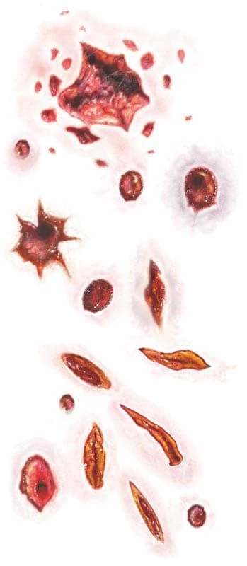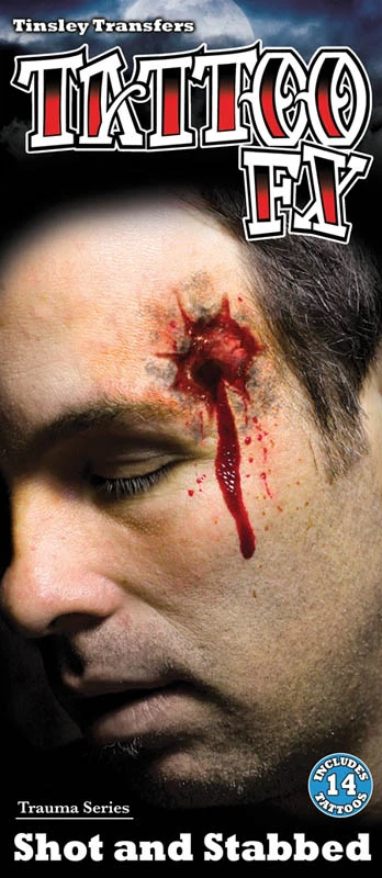 Digne d’un maquillage et des effets spéciaux professionnels dans les films d’horreur comme au cinéma, ce tatouage représente un maquillage terrifiant avec des impacts de balles au visage, du faux sang, des cicatrices, de quoi impressionner lors de la fête d’Halloween. C’est l’accessoire idéal pour compléter votre déguisement lors d’une soirée à thème.