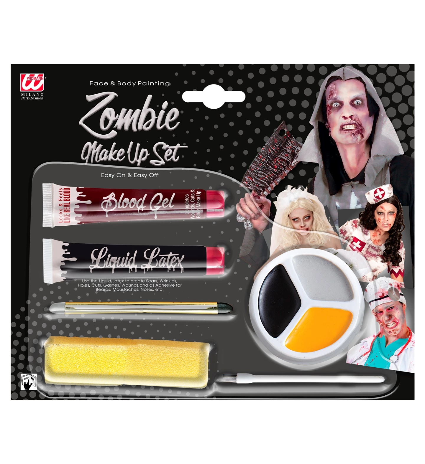 Un kit complet de maquillage de la marque Widmann avec tous les accessoires pour incarner un zombie et impressionner les invités lors d’une soirée à thème (voir photo). Cet ensemble de maquillage pour zombie va vous permettre d’avoir un visage adapté à l’événement. Ce kit est idéal pour rendre plus crédible votre personnage lors des soirées déguisées ou pour Halloween.
