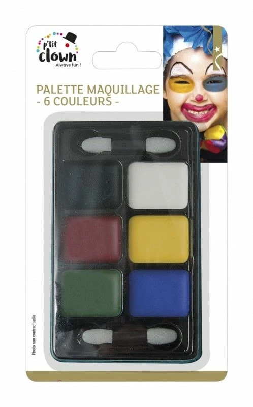 Une palette de maquillage avec 6 coloris , c’est l’assortiment qu’il vous faut pour mardi gras ou pour un carnaval, vous pourrez maquiller les enfants en animaux, mais aussi en clown et différents personnages.