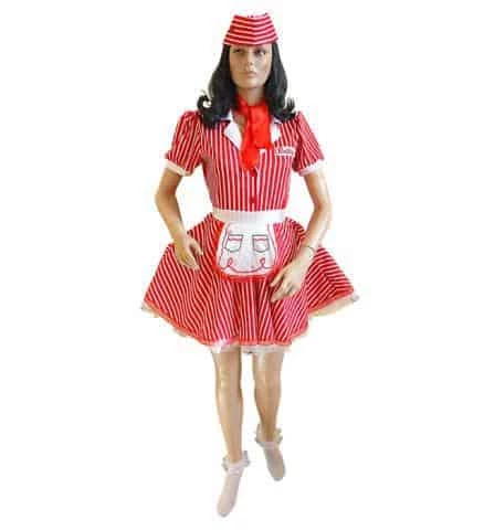 Une jolie robe de serveuse des années 50 avec un jupon, un tablier, une épingle, un foulard et un chapeau, cette robe évoque le rock ou le twist (voir vidéo), idéal pour un spectacle de danse ou de pompom girl ou bien pour compléter un déguisement lors d’une soirée à thème comme les années 50 et 60 ou autre type d’ambiance, enterrement de vie de jeune fille evjf. Cette robe de la marque Widmann est en plusieurs tailles pour adultes.