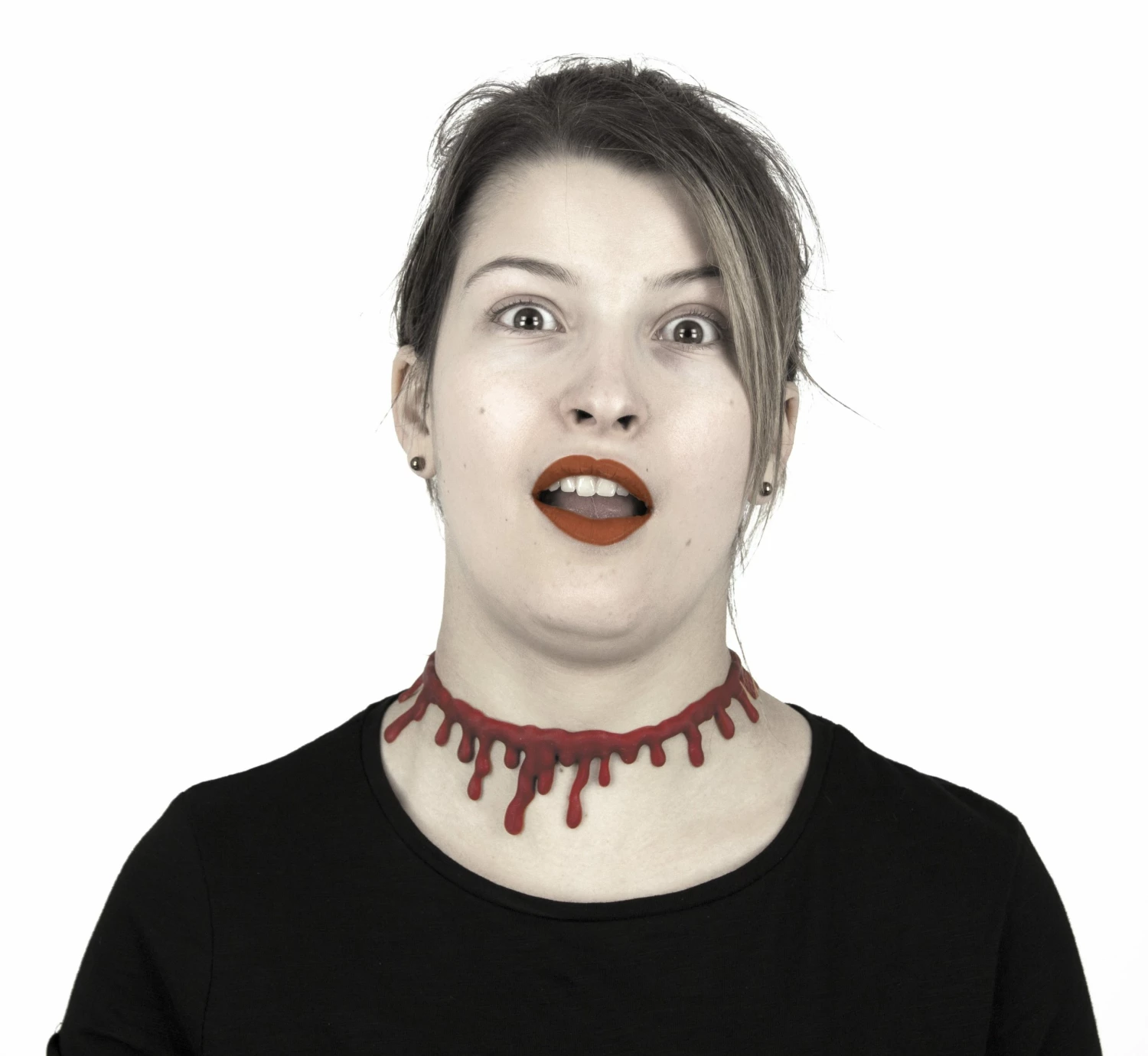 Un collier ou tour de cou pour simuler une gorge tranchée et du faux sang, idéal comme gadget ou accessoire le soir Halloween.